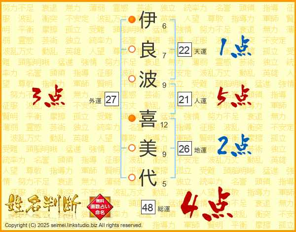伊(6画)良(7画)波(9画) 喜(12画)美(9画)代(5画)