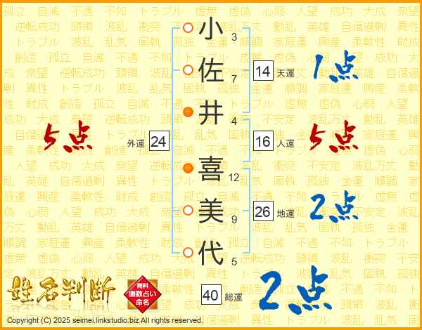小(3画)佐(7画)井(4画) 喜(12画)美(9画)代(5画)