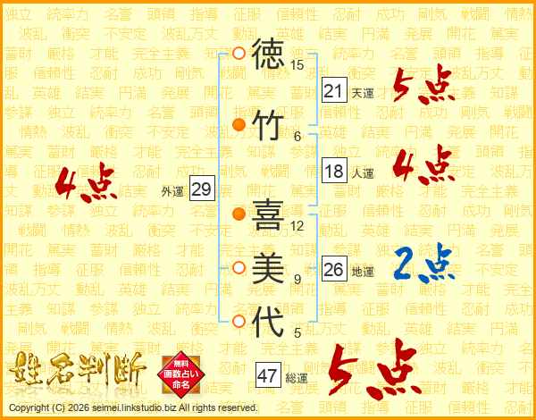 徳(15画)竹(6画) 喜(12画)美(9画)代(5画)