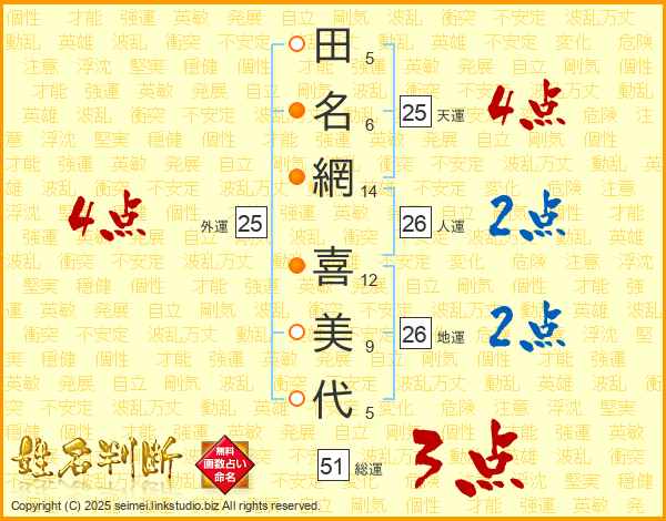 田(5画)名(6画)網(14画) 喜(12画)美(9画)代(5画)