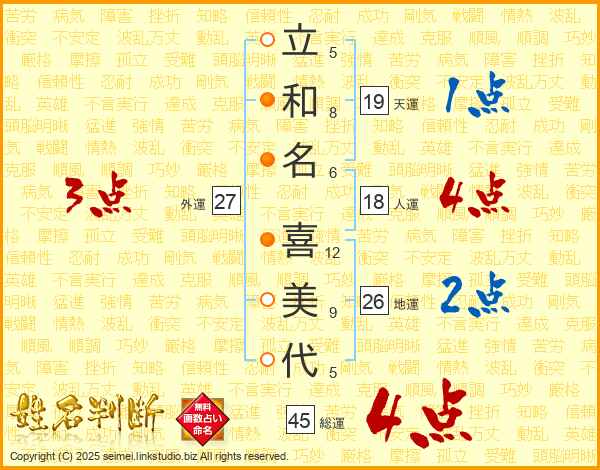 生活面を象徴する運勢です。外部から受ける影響力を表し、結婚運、家庭運や職場、環境への順応性を表します。総運から人運を引いた画数。姓や名が1文字の場合を除く。