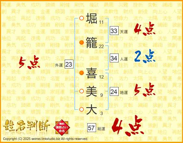 堀(11画)籠(22画) 喜(12画)美(9画)大(3画)