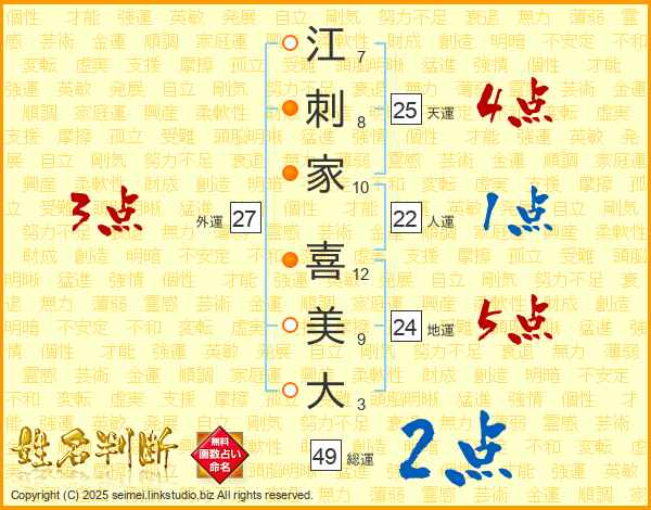 生活面を象徴する運勢です。外部から受ける影響力を表し、結婚運、家庭運や職場、環境への順応性を表します。総運から人運を引いた画数。姓や名が1文字の場合を除く。