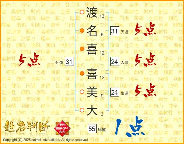 渡(13画)名(6画)喜(12画) 喜(12画)美(9画)大(3画)