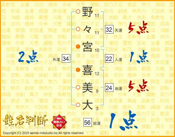 野々宮喜美大さんの総運は56画の1点!