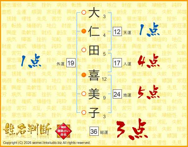 大(3画)仁(4画)田(5画) 喜(12画)美(9画)子(3画)