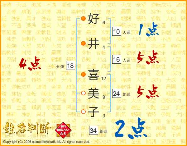 好(6画)井(4画) 喜(12画)美(9画)子(3画)