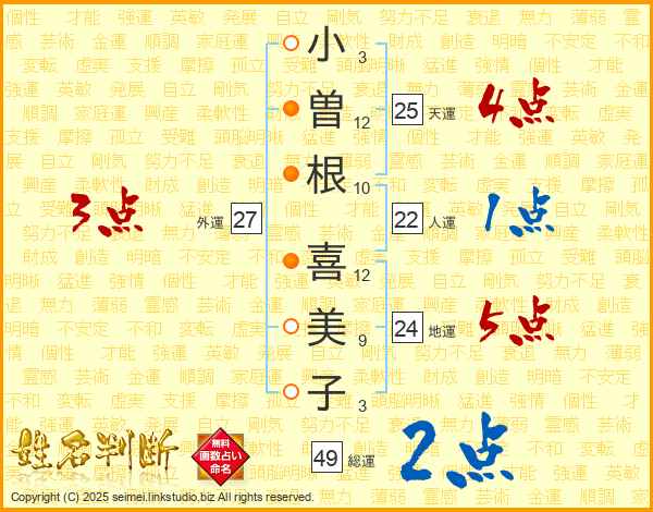 小(3画)曽(12画)根(10画) 喜(12画)美(9画)子(3画)