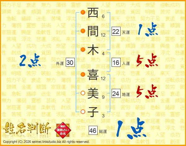 西間木喜美子さんの総運は46画の1点!