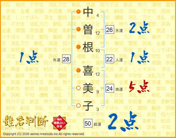 中(4画)曽(12画)根(10画) 喜(12画)美(9画)子(3画)