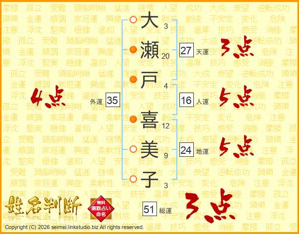 大(3画)瀬(20画)戸(4画) 喜(12画)美(9画)子(3画)
