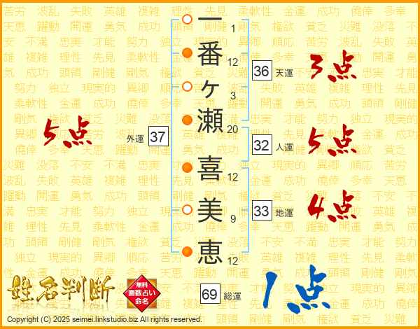 一番ヶ瀬喜美恵さんの外運は37画の5点!
