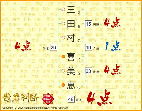 三(3画)田(5画)村(7画) 喜(12画)美(9画)恵(12画)