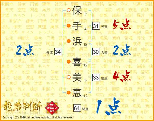 保(9画)手(4画)浜(18画) 喜(12画)美(9画)恵(12画)