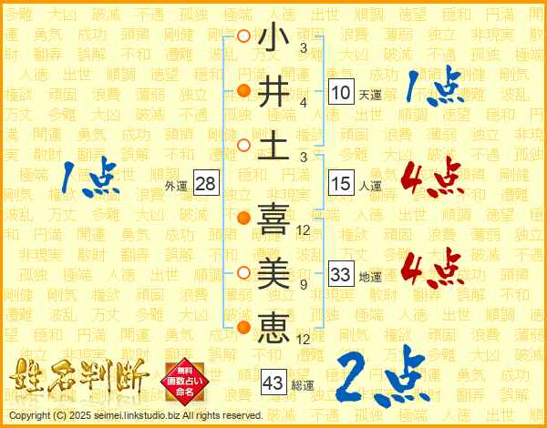 小(3画)井(4画)土(3画) 喜(12画)美(9画)恵(12画)