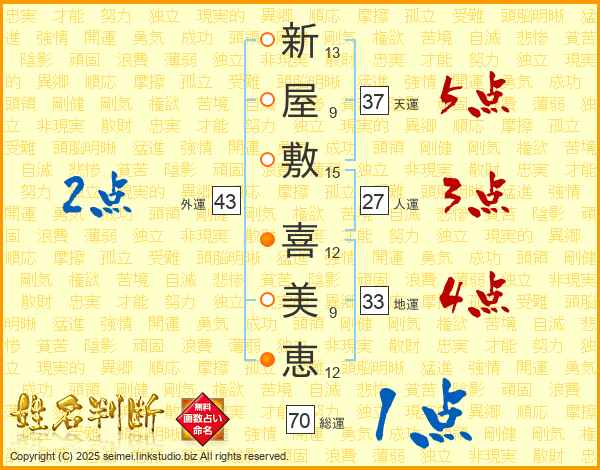 新(13画)屋(9画)敷(15画) 喜(12画)美(9画)恵(12画)
