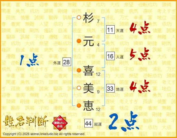 杉(7画)元(4画) 喜(12画)美(9画)恵(12画)