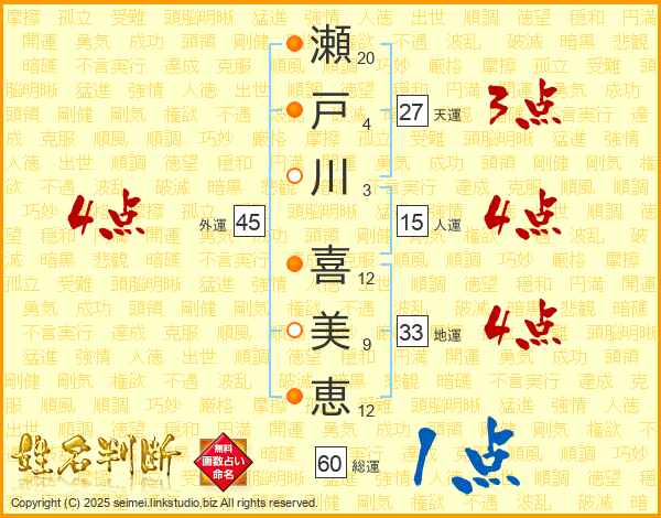 瀬(20画)戸(4画)川(3画) 喜(12画)美(9画)恵(12画)