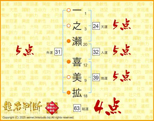 一(1画)之(3画)瀬(20画) 喜(12画)美(9画)拡(18画)
