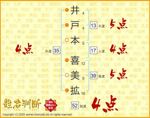 井(4画)戸(4画)本(5画) 喜(12画)美(9画)拡(18画)