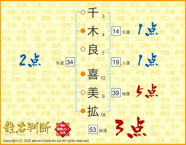 千(3画)木(4画)良(7画) 喜(12画)美(9画)拡(18画)