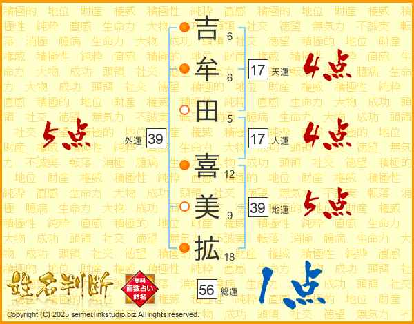 吉(6画)牟(6画)田(5画) 喜(12画)美(9画)拡(18画)