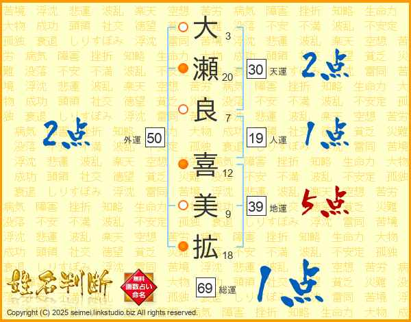 大(3画)瀬(20画)良(7画) 喜(12画)美(9画)拡(18画)