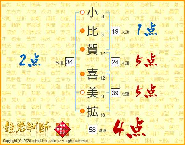 小(3画)比(4画)賀(12画) 喜(12画)美(9画)拡(18画)