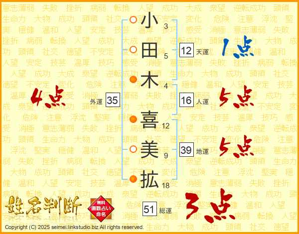 小田木喜美拡さんの地運は39画の5点!