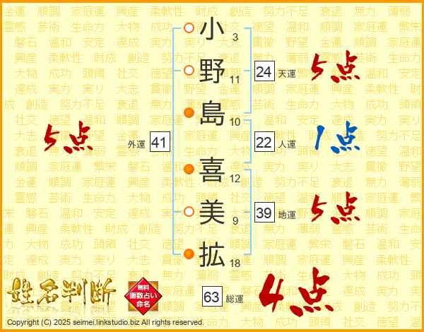 小(3画)野(11画)島(10画) 喜(12画)美(9画)拡(18画)