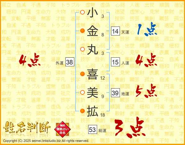 小(3画)金(8画)丸(3画) 喜(12画)美(9画)拡(18画)