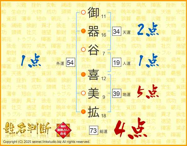御(11画)器(16画)谷(7画) 喜(12画)美(9画)拡(18画)