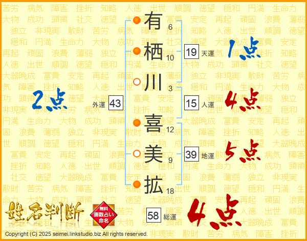 有(6画)栖(10画)川(3画) 喜(12画)美(9画)拡(18画)
