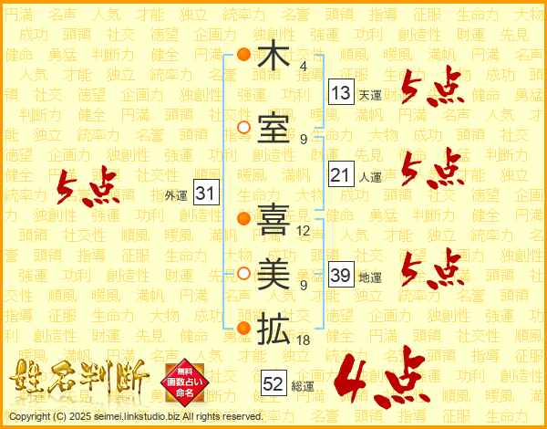 木(4画)室(9画) 喜(12画)美(9画)拡(18画)