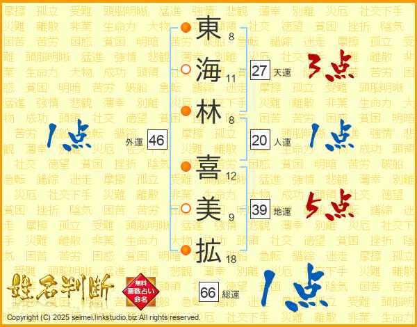東(8画)海(11画)林(8画) 喜(12画)美(9画)拡(18画)
