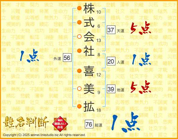 株(10画)式(6画)会(13画)社(8画) 喜(12画)美(9画)拡(18画)