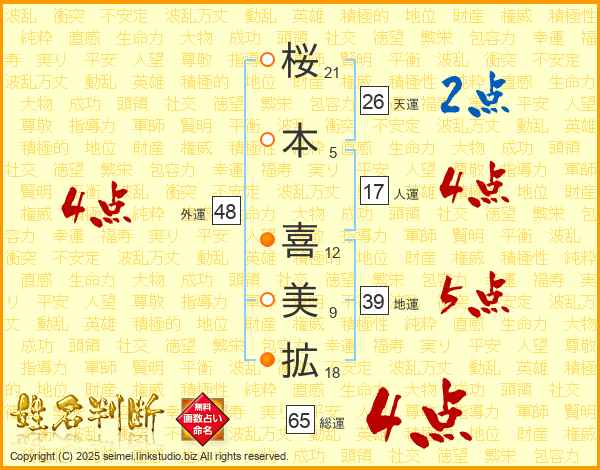 桜(21画)本(5画) 喜(12画)美(9画)拡(18画)