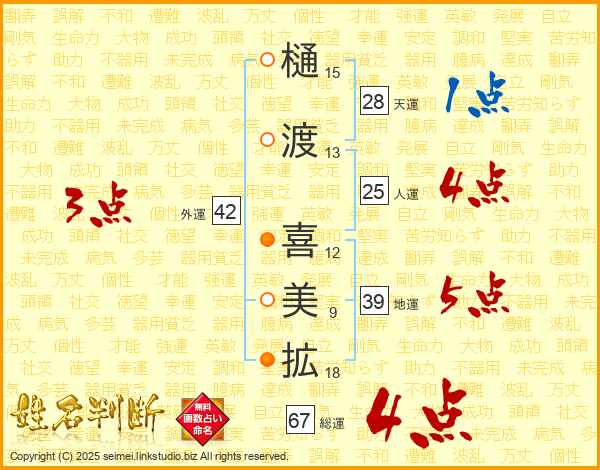 樋(15画)渡(13画) 喜(12画)美(9画)拡(18画)
