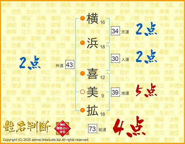 横浜喜美拡さんの総運は73画の4点!