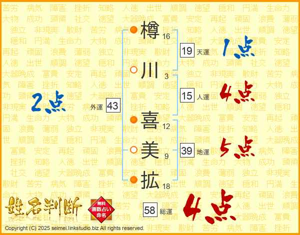 樽(16画)川(3画) 喜(12画)美(9画)拡(18画)