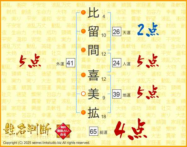 比(4画)留(10画)間(12画) 喜(12画)美(9画)拡(18画)