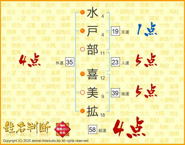 水(4画)戸(4画)部(11画) 喜(12画)美(9画)拡(18画)