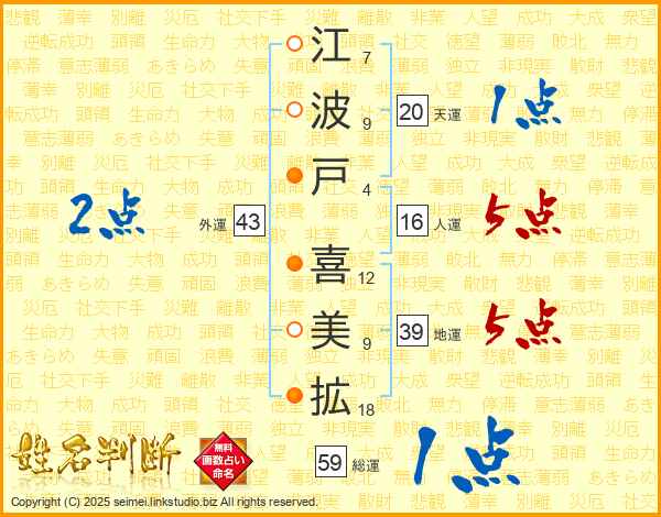江(7画)波(9画)戸(4画) 喜(12画)美(9画)拡(18画)