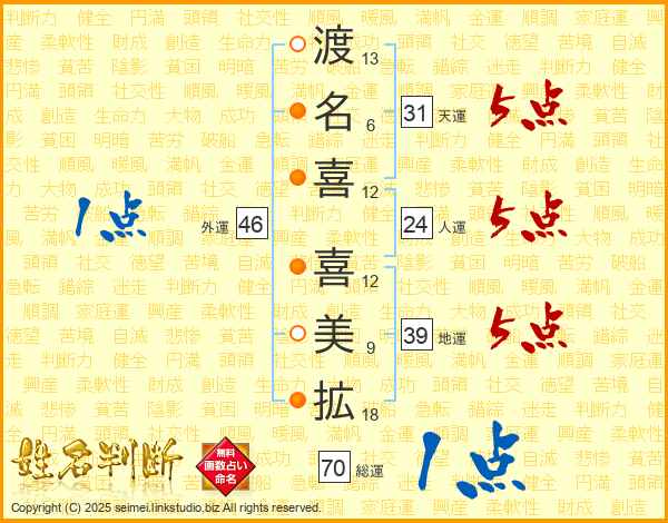 渡(13画)名(6画)喜(12画) 喜(12画)美(9画)拡(18画)