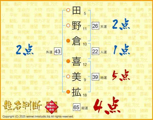 田(5画)野(11画)倉(10画) 喜(12画)美(9画)拡(18画)