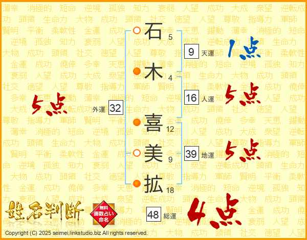 石(5画)木(4画) 喜(12画)美(9画)拡(18画)