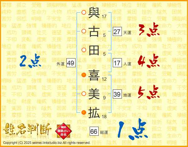 與(17画)古(5画)田(5画) 喜(12画)美(9画)拡(18画)
