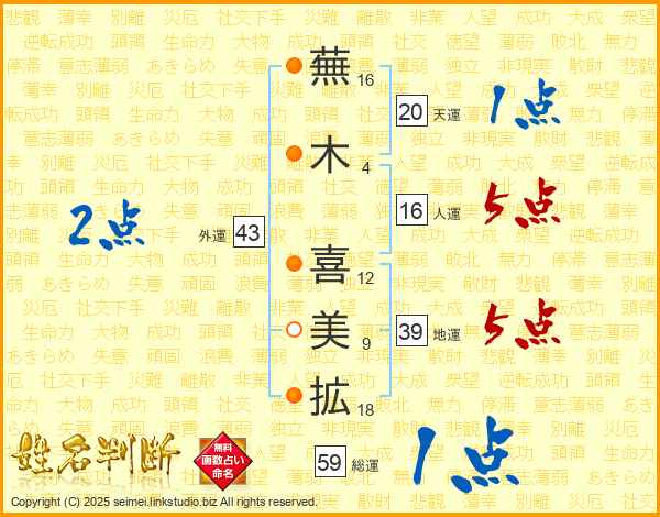 蕪(16画)木(4画) 喜(12画)美(9画)拡(18画)