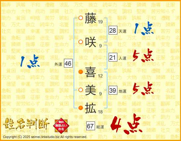 藤(19画)咲(9画) 喜(12画)美(9画)拡(18画)