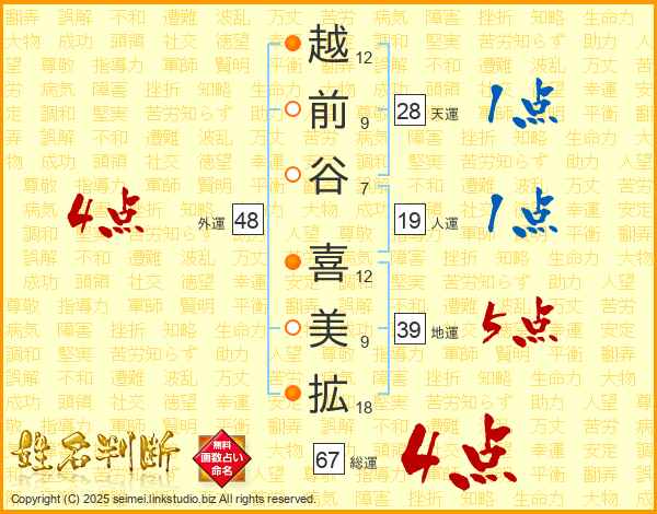 越(12画)前(9画)谷(7画) 喜(12画)美(9画)拡(18画)